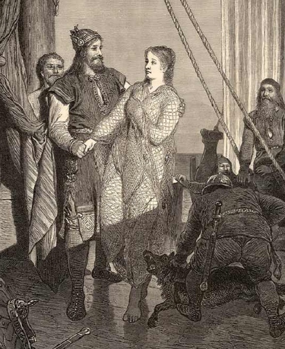 Свадьба. Наши свадебные традиции во многом схожи с обычаями викингов. Согласно сагам, решение о соединении отпрысков принимали не только старшие - молодожены имели право голоса в выборе второй половинки. Брачная подготовка была непростой. Сначала жених с делегатами отправлялся к невесте делать предложение. В случае ответа «Да», семьи урегулировали имущественные и наследственные вопросы, а также собирали подарки - шкуры, одежду, предметы мебели и быта, оружие. Сами свадьбы длились несколько дней, гости веселились от души. Свадебная процессия до места регистрации брака состояла из множества людей. Считалось, что чем больше они пройдут и чем громче будут шуметь, тем прочнее и счастливее окажется союз. Муж и жена подавали друг другу кольца на наконечниках мечей. Первая брачная ночь проходила на виду у доверенных лиц, обязанных засвидетельствовать невинность супруги.