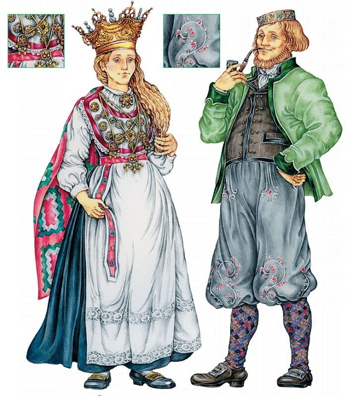 Форма одежды низших сословий, несмотря на влияния моды, оставалась все той же, как и в языческие времена. Как правило, они носили некрашеную одежду натуральных цветов из грубой холщовой ткани: чулки, короткие штаны, длинную шерстяную рубашку, поверх куртку или прямоугольный плащ. На руках полагалось носить варежки. К слову, даже в русском языке это слово имеет корень, связанный со словом «варяги», то есть викинги. А на голову надевали широкополую шляпу или низкую шапку с большими бортами и завязками под подбородком. Она могла изготовляться из шерсти, войлока или меха. Кстати сказать, повседневная рабочая одежда предназначалась не только для низшего сословия, но и для состоятельных людей, которые просто ходили в ней по дому или проводили свой досуг, занимаясь ремеслом.
